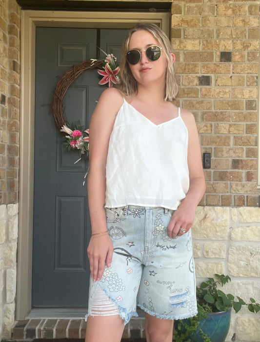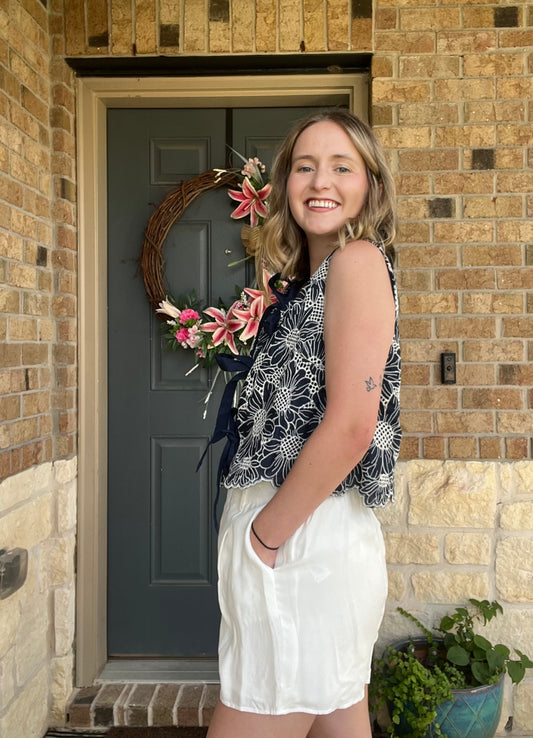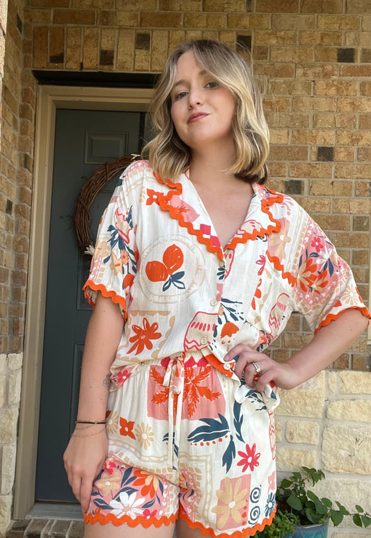 Orange Floral and Fruit Print Wavy Trim Drawstring Shorts