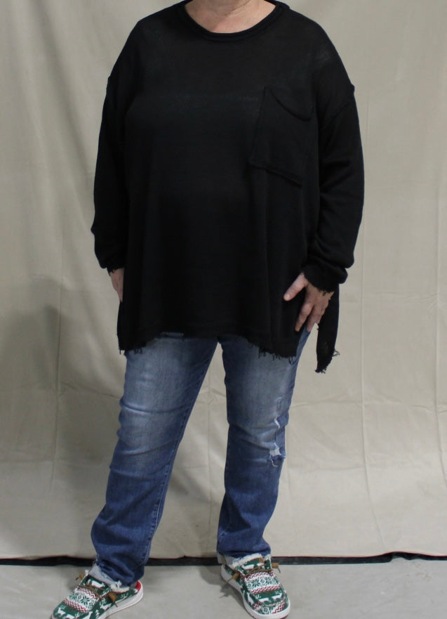 Introducing our Black Frocket Sweater – where fashion meets functionality. This sleek, light weight black sweater combines style with a front pocket detail, adding a modern twist to a classic piece. This loose fitting sweater is crafted for both comfort and versatility, making it perfect for a casual yet polished look. Elevate your winter wardrobe with the timeless charm of our Black Frocket Sweater – an essential piece that effortlessly blends fashion and everyday functionality.