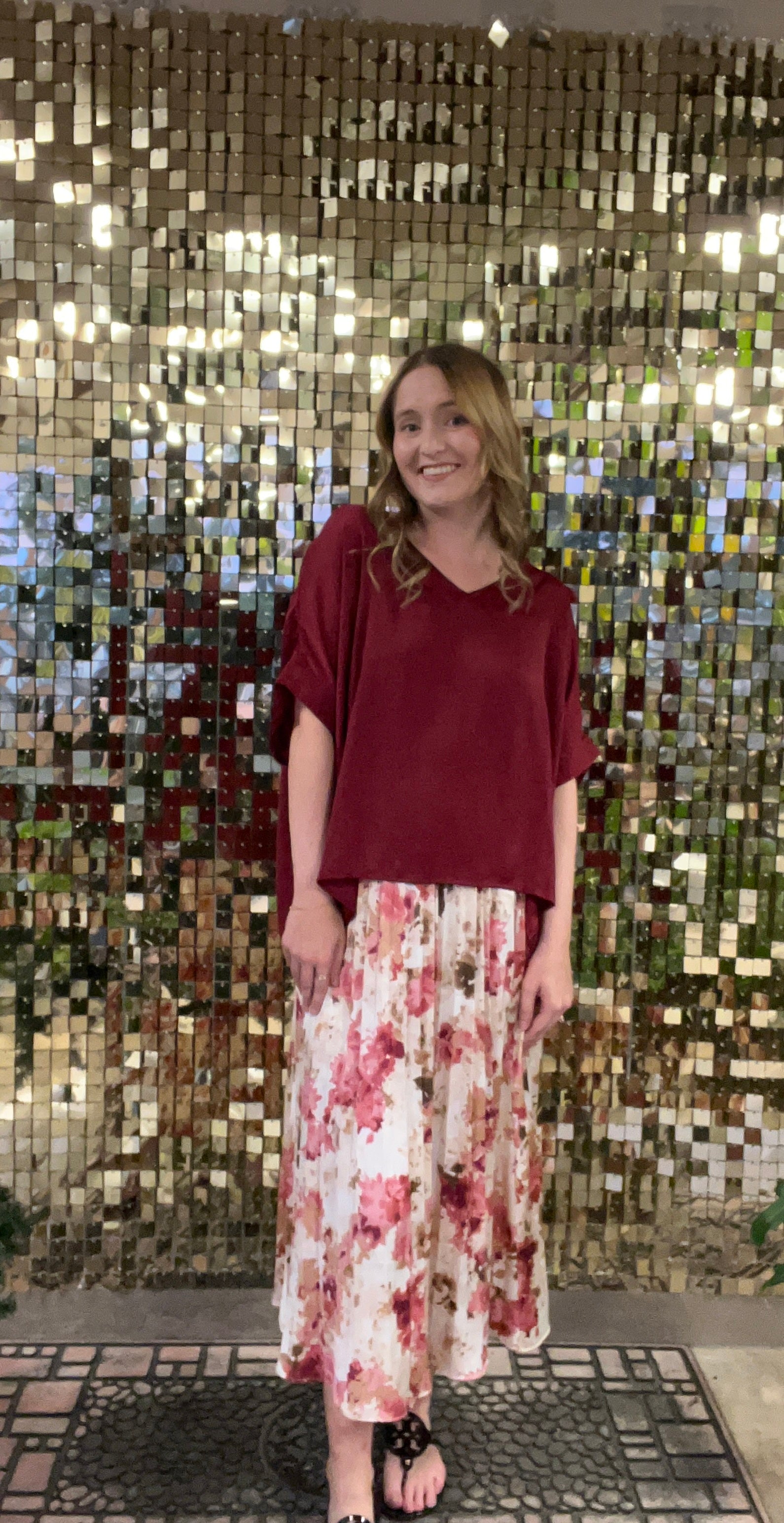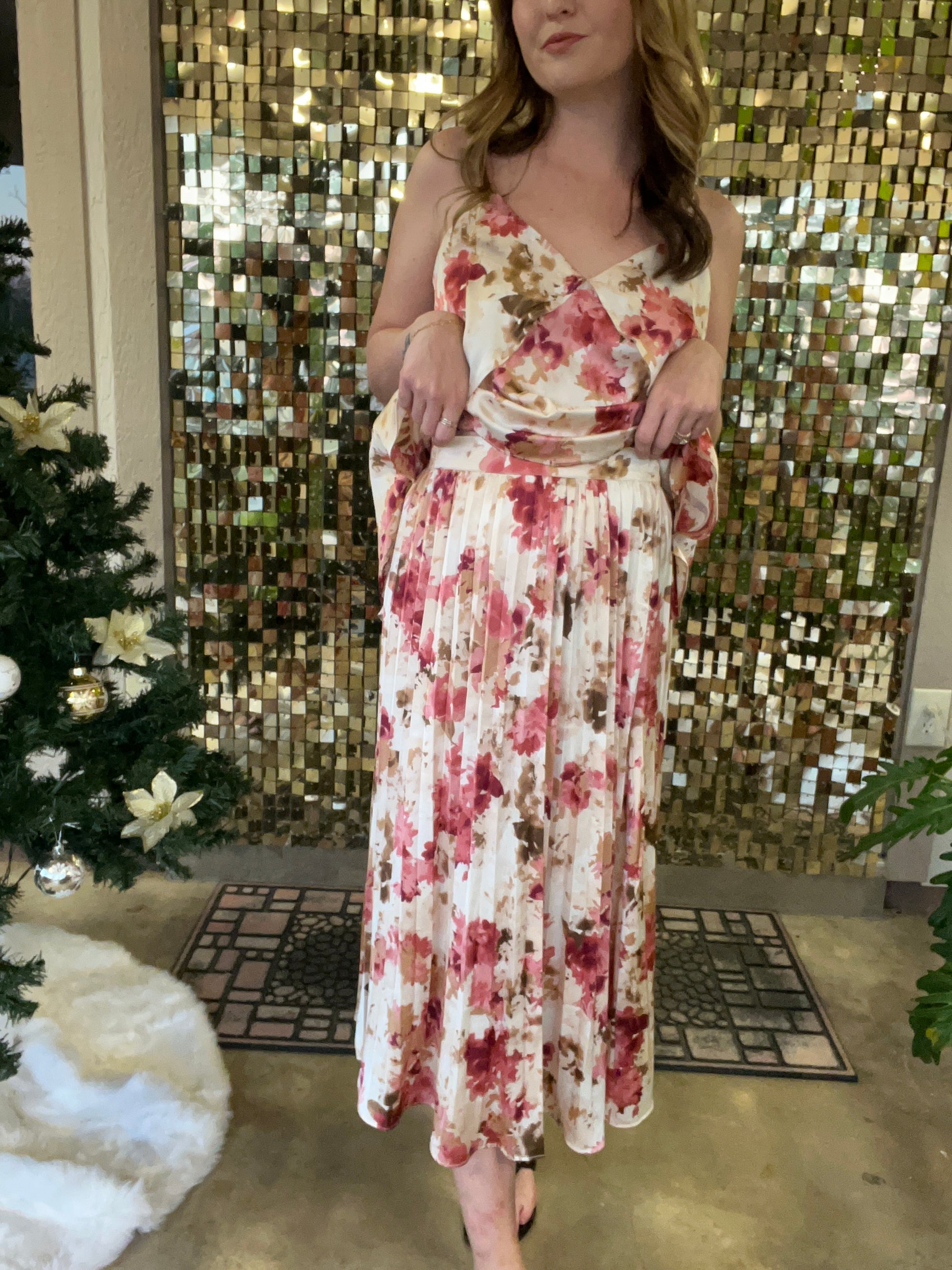 Bring a touch of elegance and whimsy to your wardrobe with our Girls Dinner Pink Floral Pleated Midi Skirt. The soft cream, pink, and red floral print adds a romantic vibe, while the pleated design and elastic waistband across the back ensures fluid movement and a flattering, feminine silhouette. The midi length is perfect for dressing up or down, making it a versatile piece for any occasion—whether you're headed to a dinner date, brunch with friends, or a casual day out. Pair it with a simple top for a laid-back look, or complete these looks by pairing it with our Girls Dinner Pink Floral Front Layered Tank OR our Burgundy Sweet Treat Dolman Sleeve V-Neck Top!