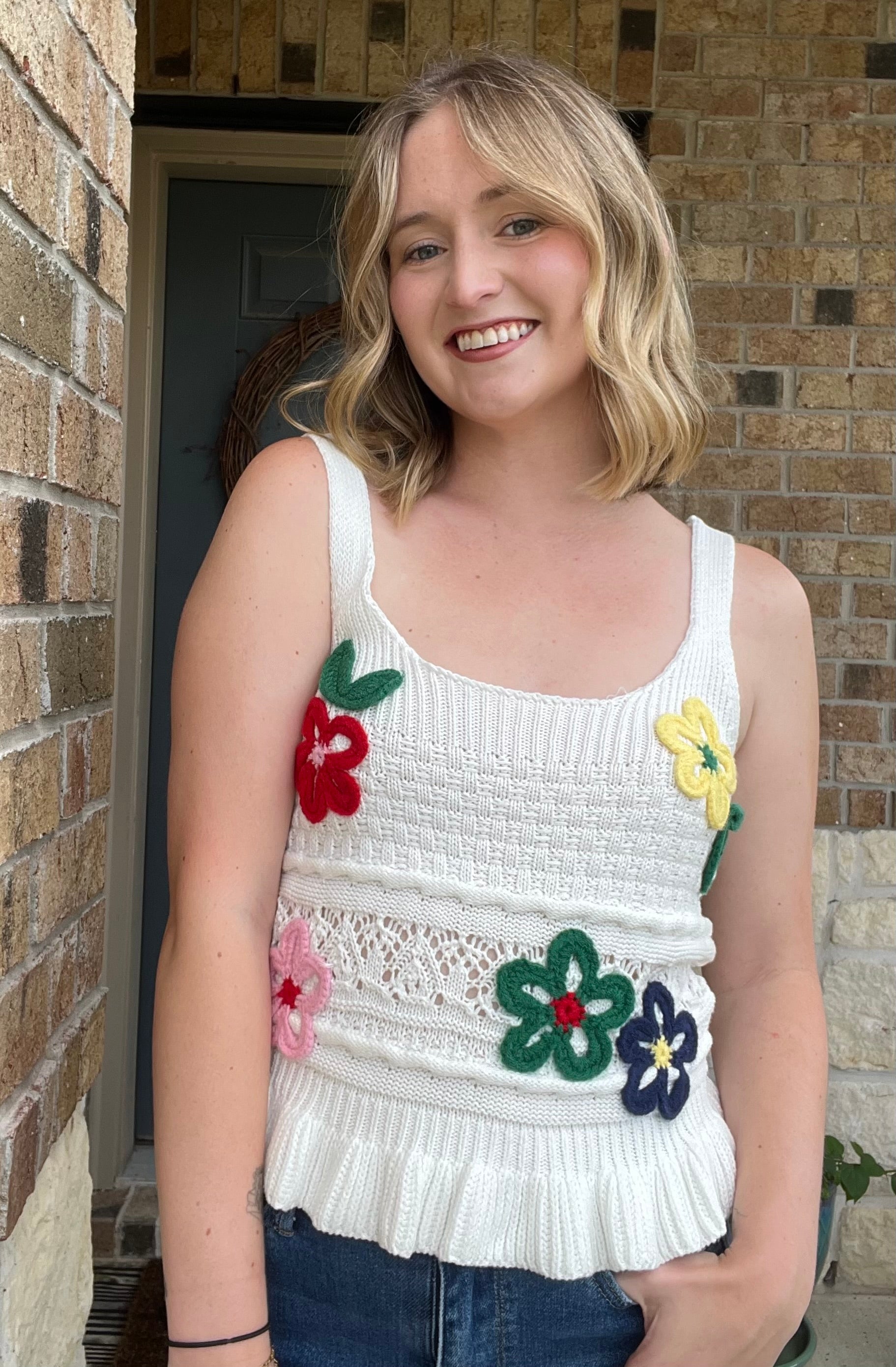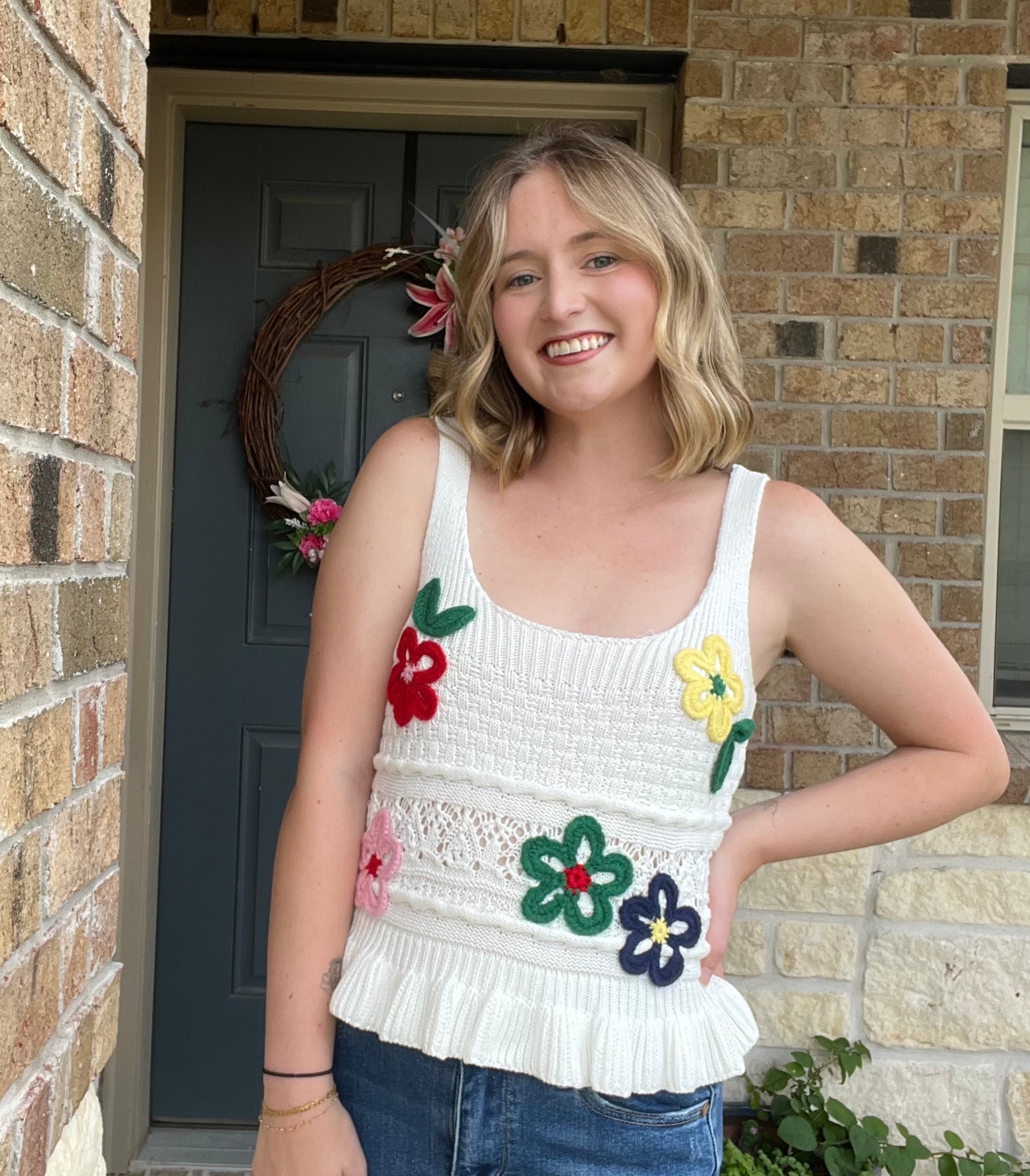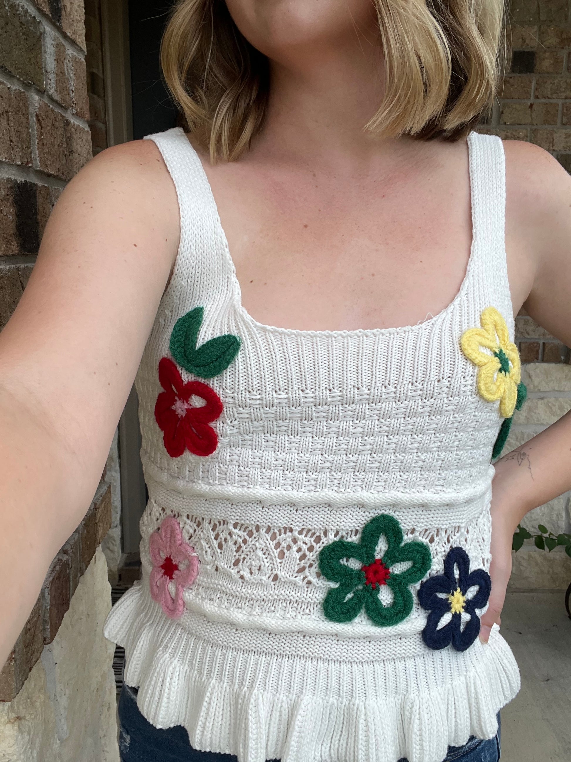 Ivory Embroidered Floral Scoop Neck Ruffle Hem Knit Top