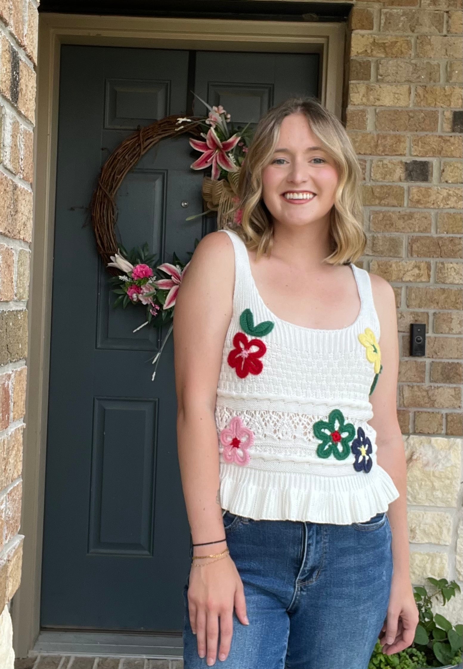 Soft, sweet, and not to be underestimated. This embroidered scoop neck top brings the charm with delicate floral details and a flouncy ruffle hem—but make no mistake, she’s got a confident streak. Pair her with denim, heels, and that “I know I look good” energy. Also available in black!