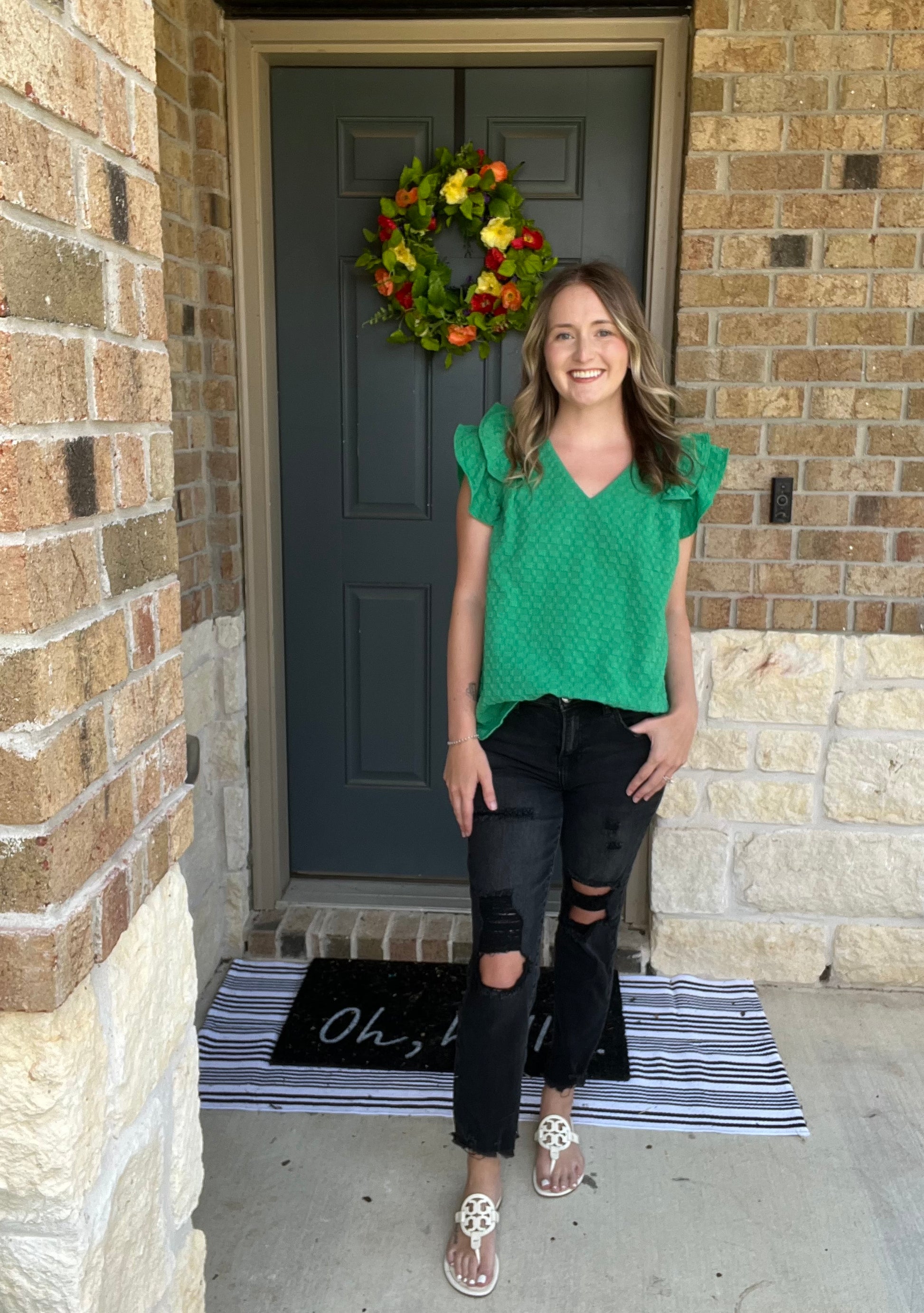 Brighten up your wardrobe with our Kelly Green Checker Pattern Ruffle Sleeve Top. This eye-catching piece features a vibrant green and white checker pattern that adds a playful yet sophisticated touch. The ruffle sleeves bring a hint of whimsy and elegance, creating a flattering silhouette that moves with you. Crafted from lightweight, breathable fabric, this top is perfect for both casual outings and dressier events. Pair it with our Risen Straight Leg Jeans - Black to complete this look!
