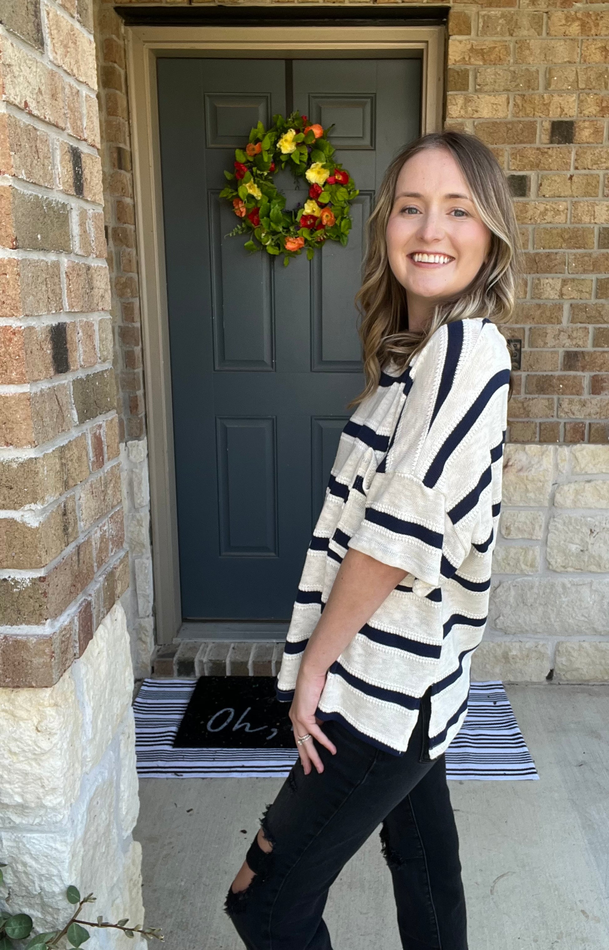 Meet your new go-to essential: the Navy and Cream Striped Knit Relaxed Tee. This soft, breathable fabric offers all-day comfort, while the classic striped pattern adds a timeless touch to your casual wardrobe. With its relaxed fit and lightweight design, it's perfect for layering or wearing on its own. Pair it with your favorite denim or shorts for an effortlessly chic look, whether you're running errands or enjoying a laid-back weekend. Elevate your everyday style with this versatile tee!