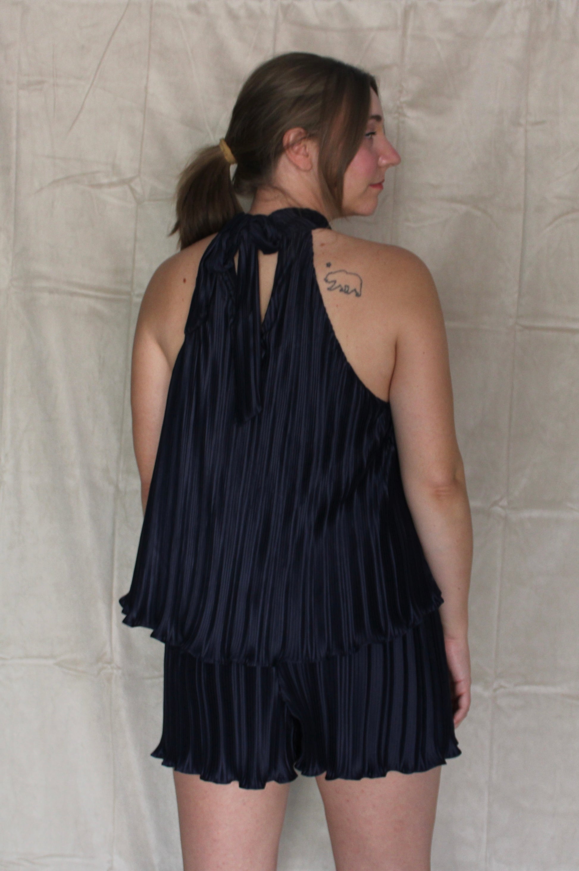 Indulge in the allure of our Navy Halter Two-Piece Short Set. This captivating ensemble features a stylish halter top that beautifully accentuates your shoulders, paired with coordinating shorts for a chic and coordinated look. The rich navy hue adds a touch of sophistication to your wardrobe, making it a standout choice for special occasions or a stylish day out. Crafted with comfort in mind, the shorts feature an elastic waistband to effortlessly combine fashion and ease, ensuring you radiate confidence with every step. Embrace a bold and fashionable statement with our Navy Halter Two-Piece Short Set.