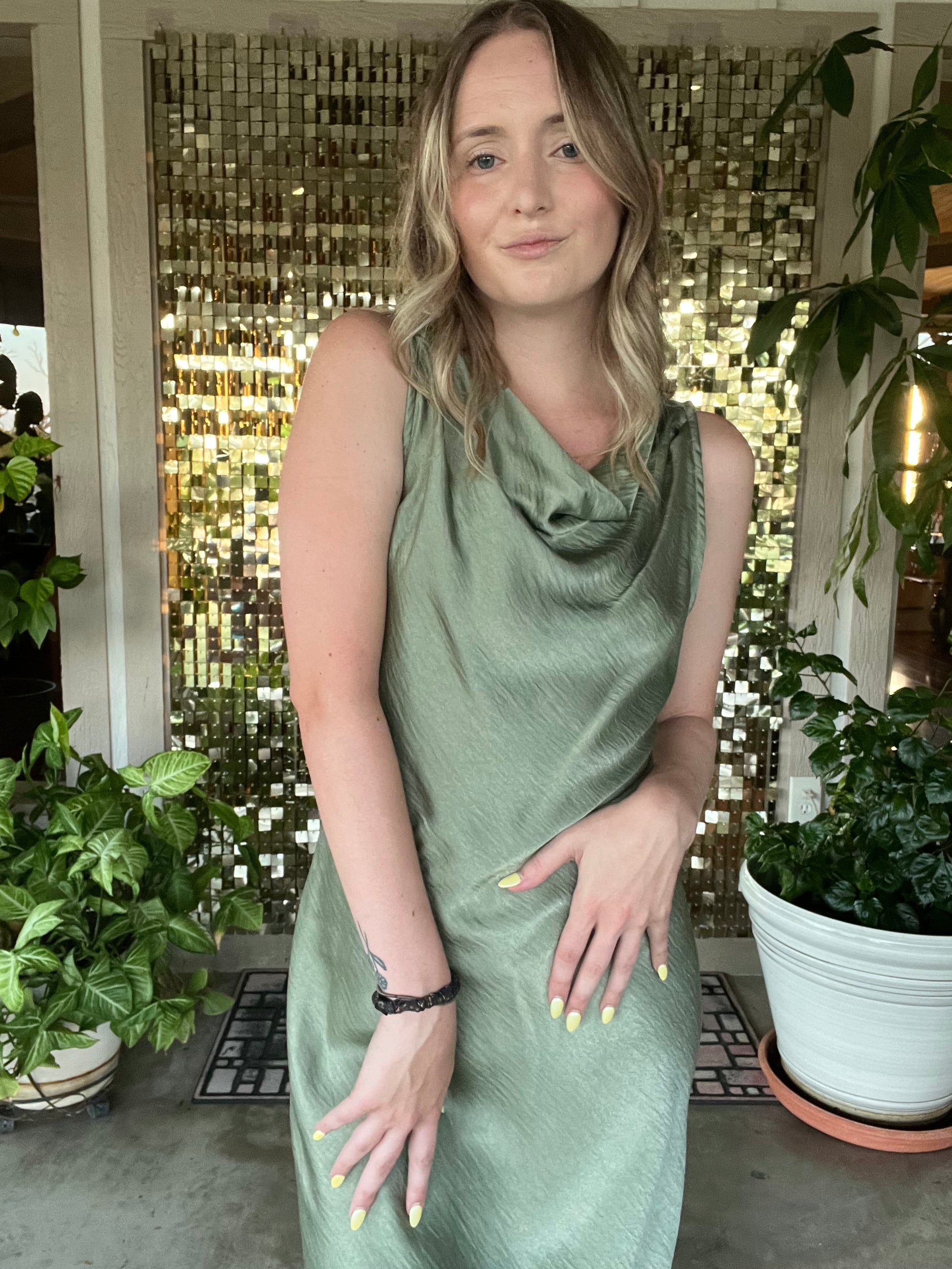 Whether dressed up with heels and jewelry or paired with chic flats for a more relaxed look, the Olive Satin High Cowl Neck Midi Dress promises to be a versatile and stunning addition to your wardrobe.