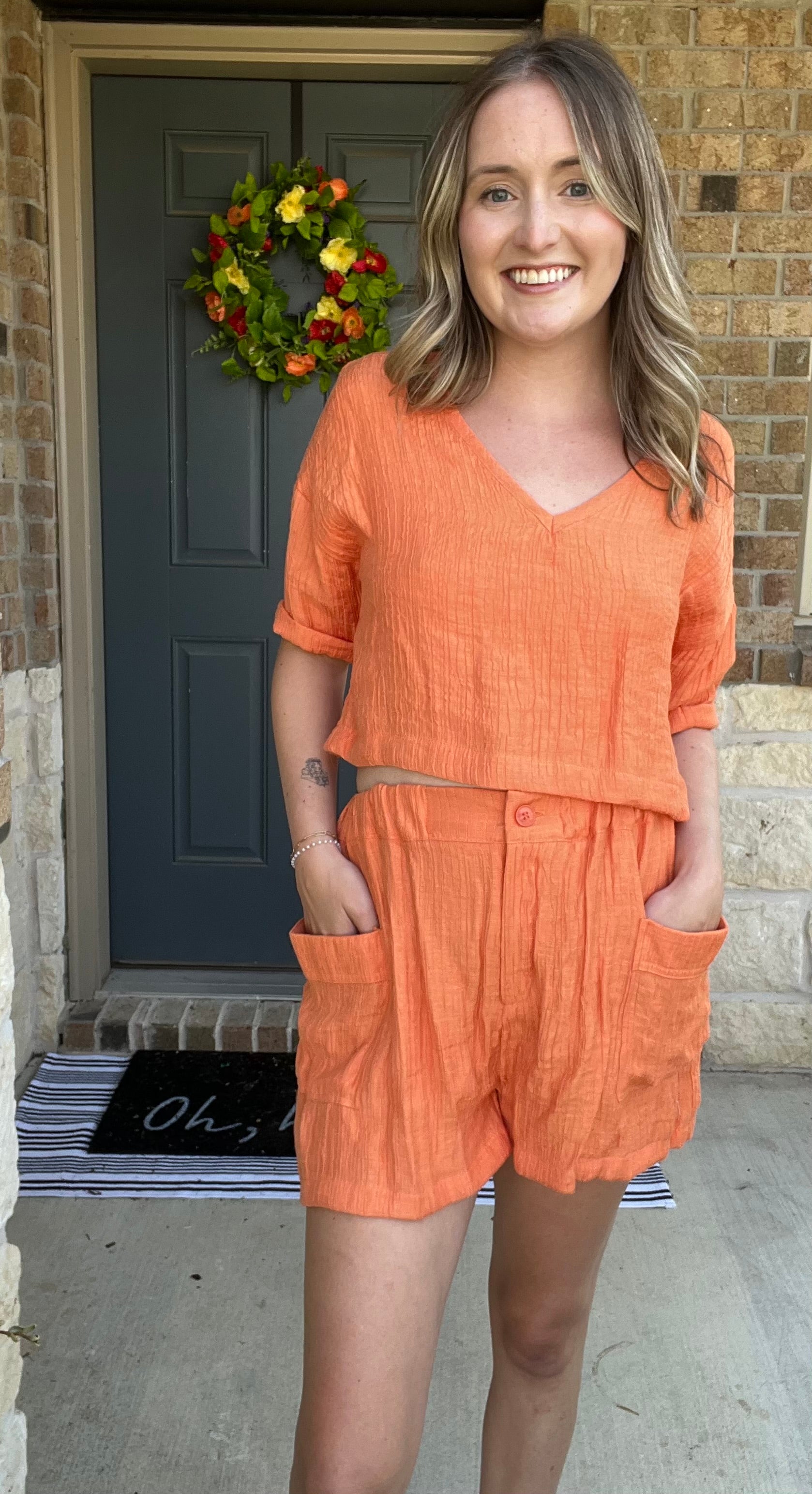 Elevate your summer style with our Orange Linen V-Neck Cropped Top. This lightweight, breathable piece features a flattering V-neckline and a relaxed fit, perfect for pairing with high-waisted jeans or skirts. The vibrant orange hue adds a fresh pop of color to your wardrobe, making it a go-to for warm-weather outings. Crafted from soft linen, it ensures all-day comfort while keeping your look effortlessly chic. Dress it up or down—this versatile top is a must-have for sunny days! We recommend pairing it with our Orange Linen Button Close Shorts to complete the look!