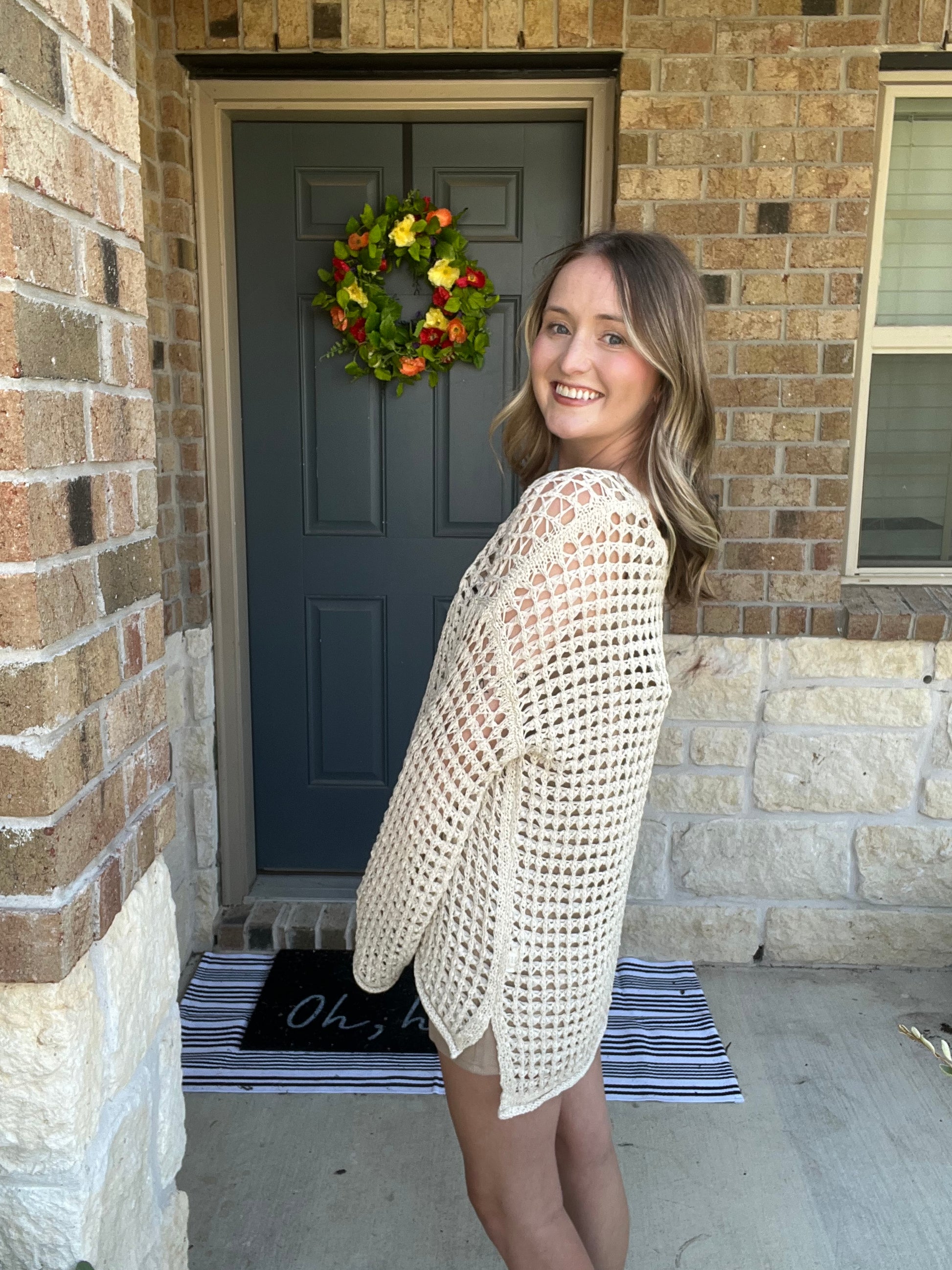 Introducing our Relaxed Sheer Crochet Knit Pullover, a perfect blend of bohemian charm and contemporary style. This lightweight piece features intricate crochet detailing that creates an airy, textured look. With its relaxed fit and dropped shoulders, it offers effortless comfort while adding a touch of elegance to any outfit. Ideal for layering over a tank top or dress, this pullover is perfect for relaxing days or casual outings. We recommend pairing it with our Mocha Tie Strap Romper to complete the look! Embrace laid-back luxury and make it a staple in your wardrobe for an easy, stylish finish.