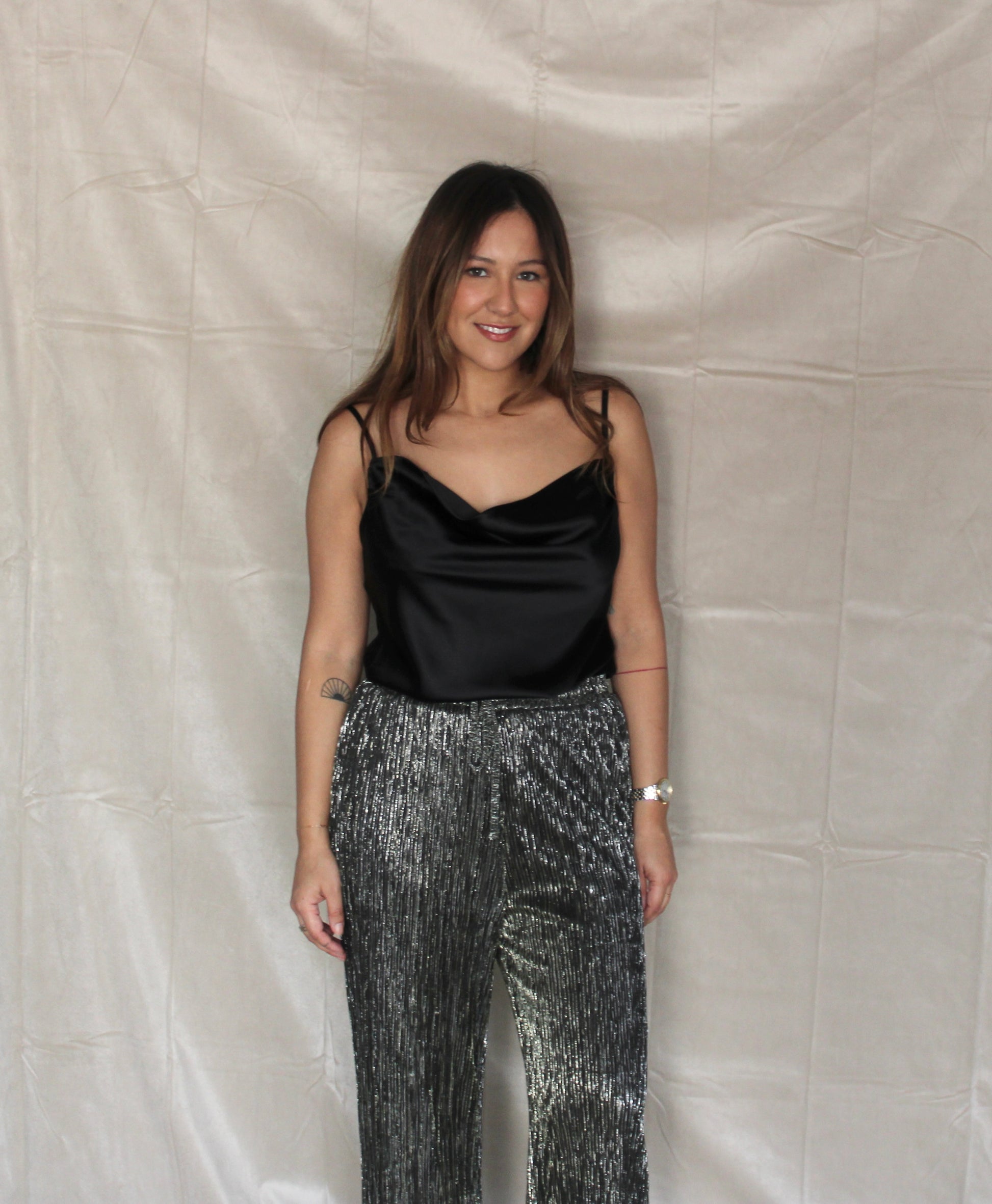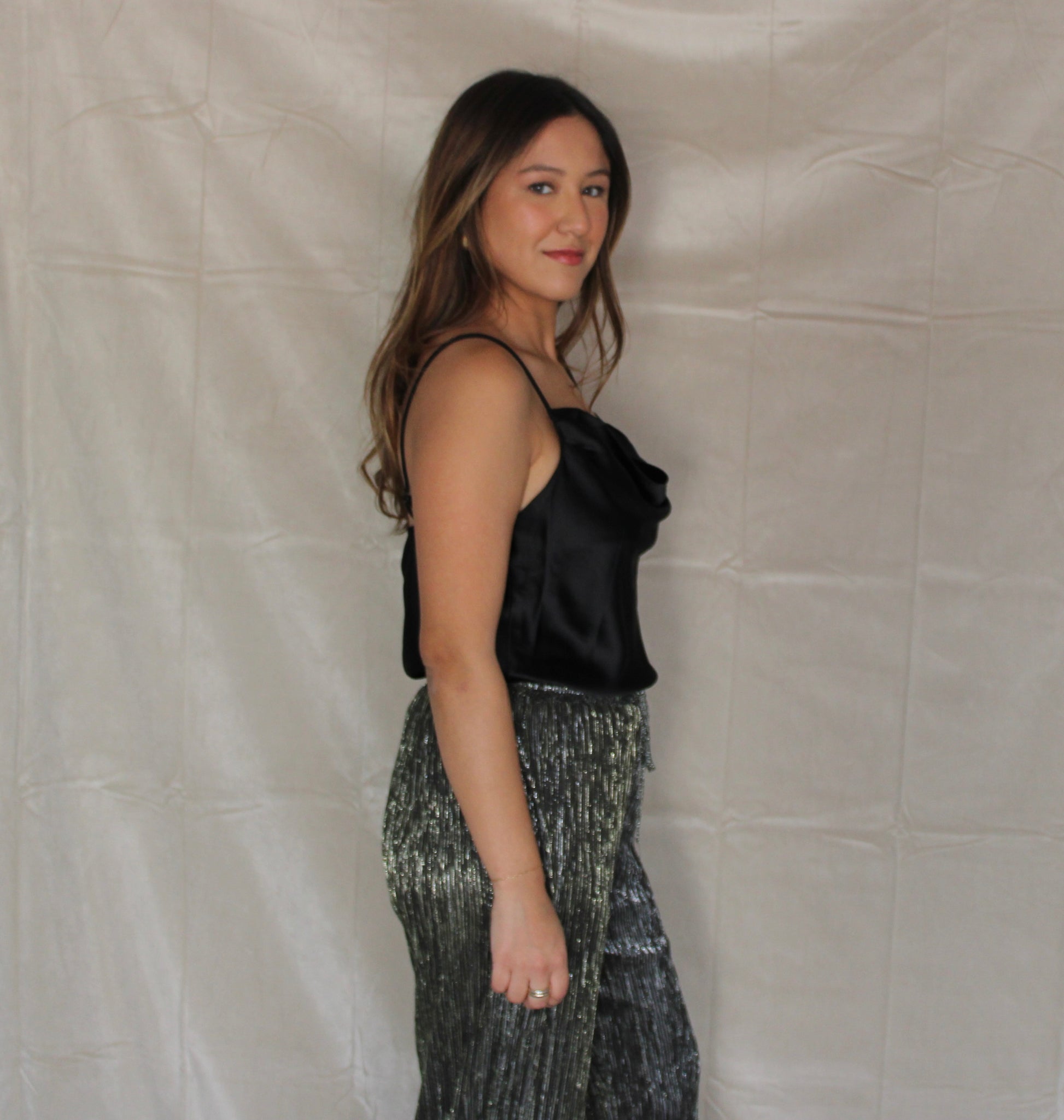 Elevate your wardrobe with our sensual Black Silk Cowl Neck Bodysuit. The luxurious silk-like fabric drapes gracefully, creating a flattering silhouette that seamlessly combines comfort and style. The cowl neck adds a touch of sophistication, making it a versatile piece for both formal and casual occasions. Whether paired with a chic skirt for a night out, with tailored pants for a polished look or our Midnight Shimmer Pants for your next holiday party, this bodysuit is a statement of understated elegance.