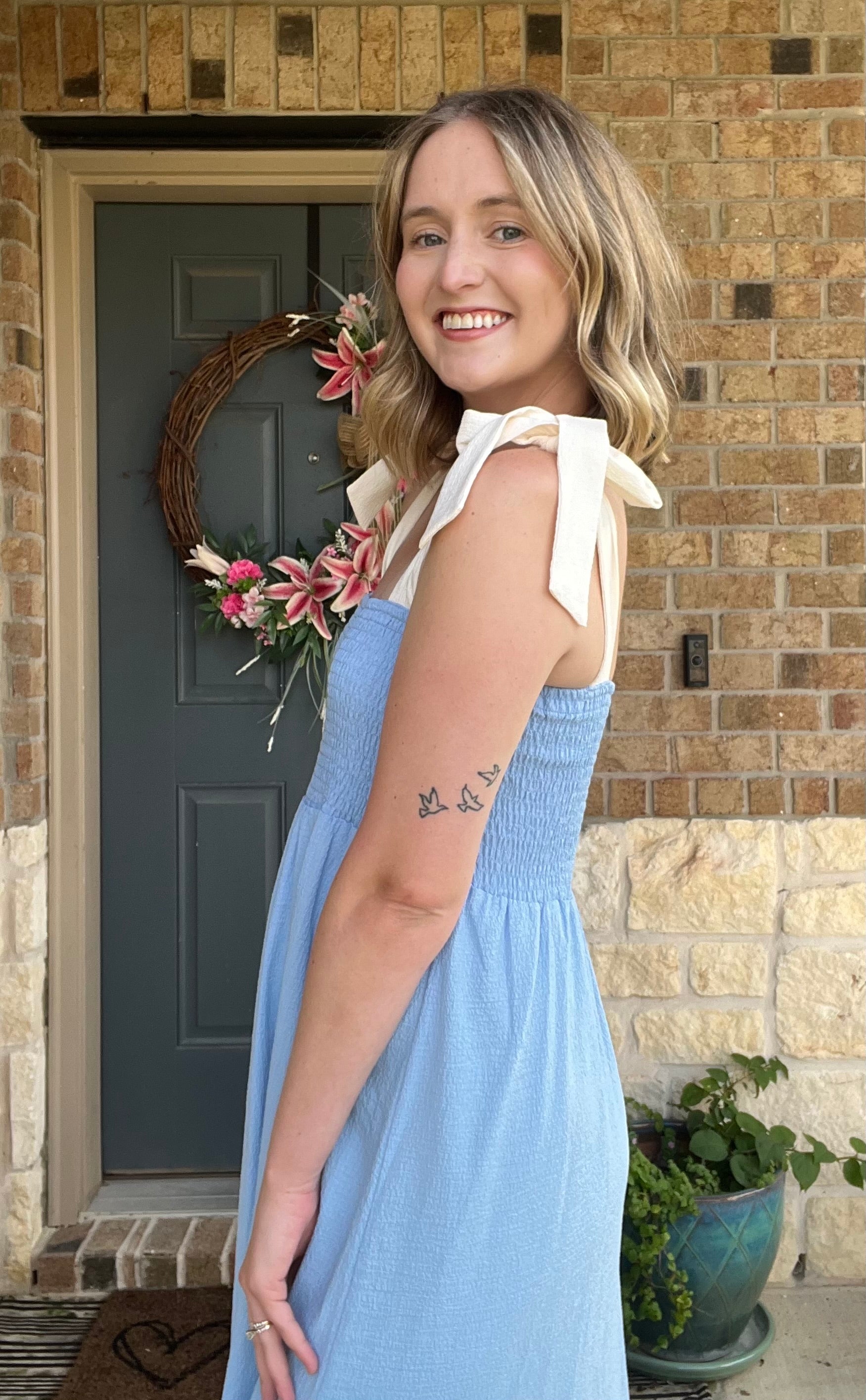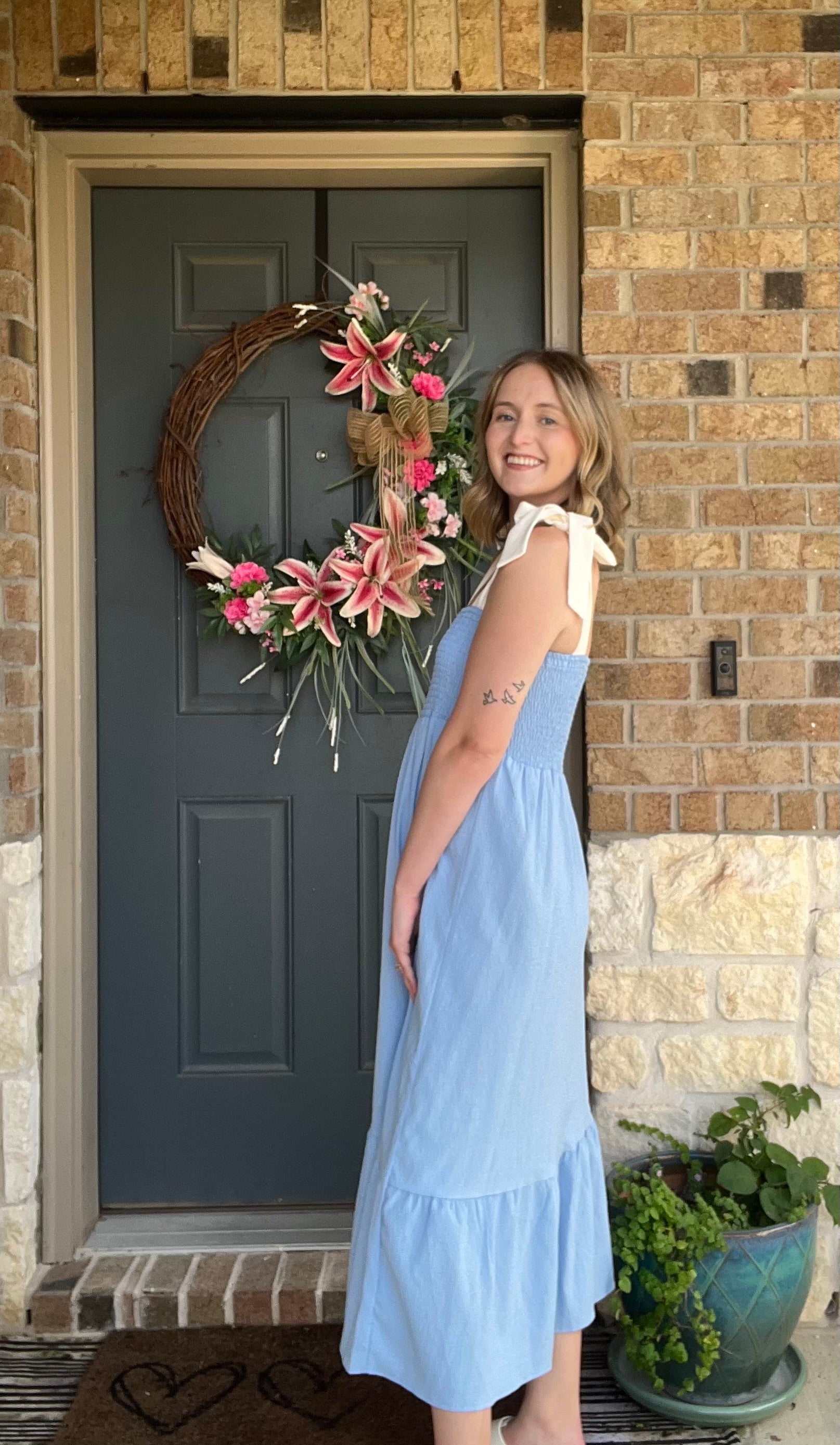 Soft, sweet, and summer-ready—our Delilah Dress is everything you want for warm-weather days. This breezy, smocked midi features a dreamy sky blue and cream floral tie straps that add a flirty pop. The stretchy smocked bodice flatters effortlessly while the flowy skirt brings the twirl factor. Pair it with sandals for brunch or dress it up with wedges!