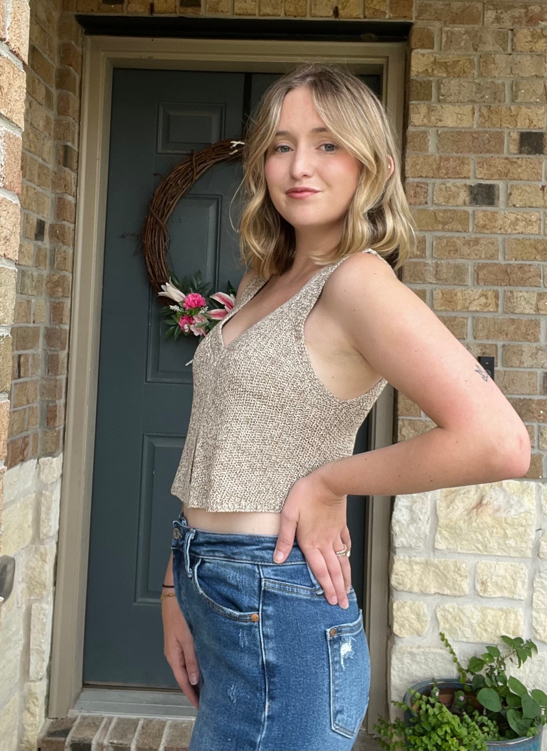 Cardigan? Vest? Crop top? Yes. This hook-front knit piece doesn’t play by the rules—and neither do you. With its flattering cropped fit and neutral taupe tone, it’s made for layering, styling, and turning heads without even trying.