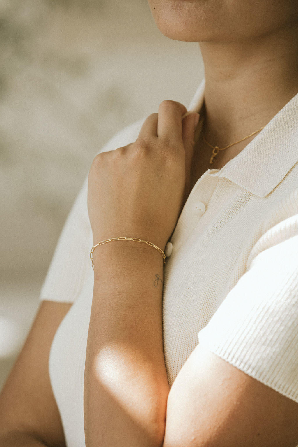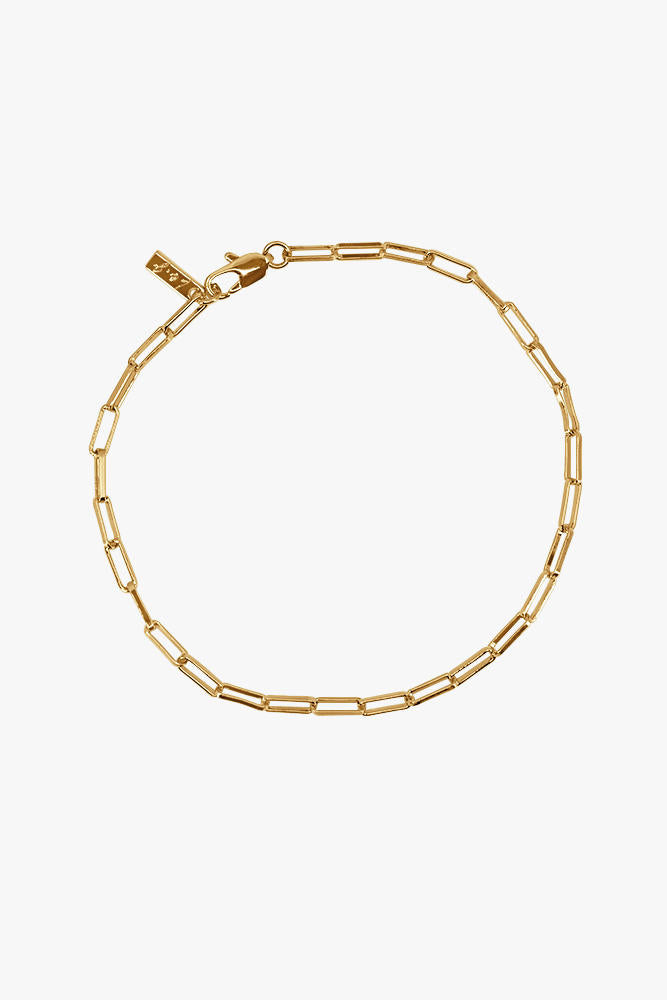 Delicate, sleek, and effortlessly chic, The Casey Chain Bracelet is the epitome of minimalist sophistication. Featuring fine rectangular links with a polished 18kt Plated Gold finish, this lightweight bracelet is perfect for those who appreciate understated elegance or need another piece of jewelry to add to their bracelet stack.