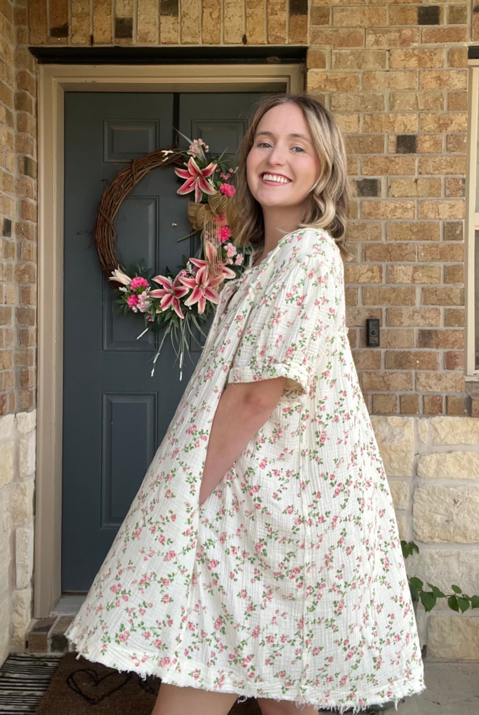 Sweet, but knows what she’s doing. This white cotton dress features a breezy fit, short sleeves, and an allover floral print that’s effortlessly pretty with just enough edge. Throw on some sandals or sneakers and go own the day—cute was never this powerful. Plus, it has pockets!